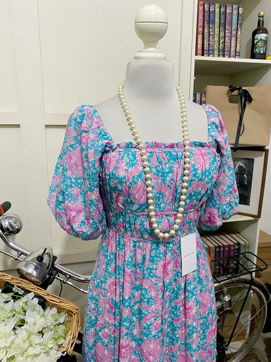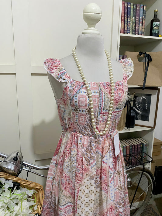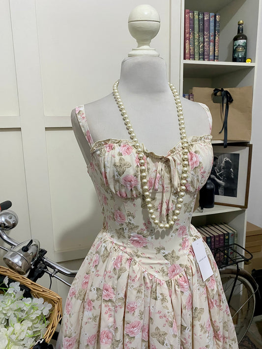 Sarah, vestido midi línea A albaricoque flores tirantes