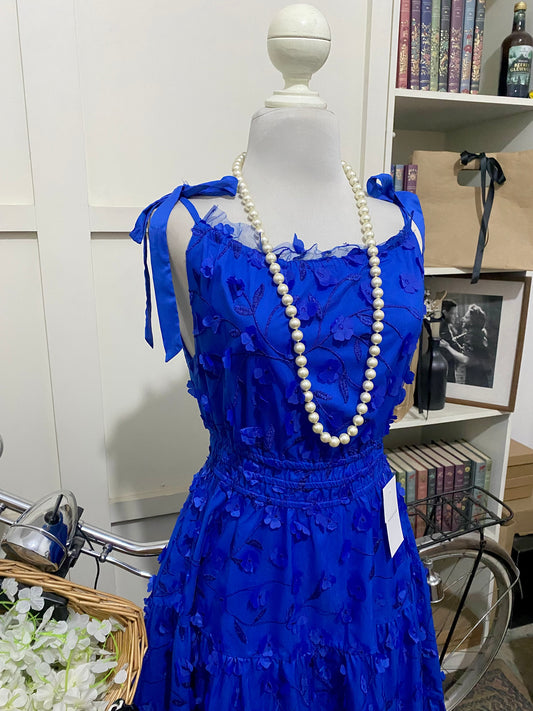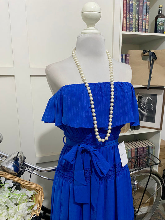 Vania, vestido largo línea A azul rey o real hombros descubiertos