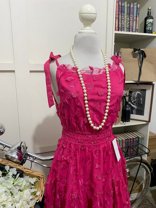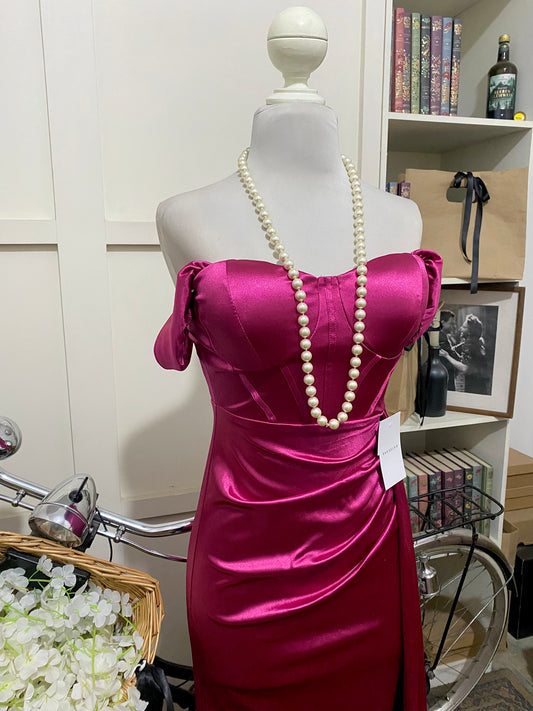 Cayetana, vestido largo ajustado fucsia hombros descubiertos manga caída