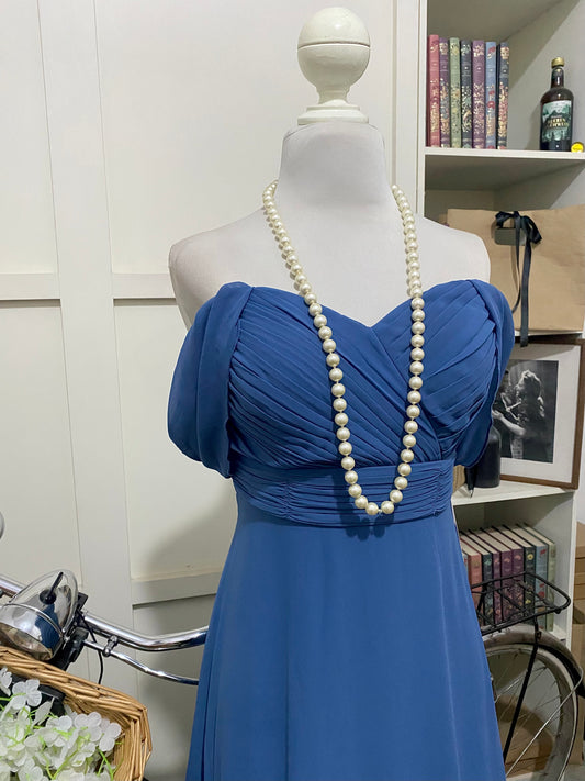 René, vestido largo línea A neblina azul hombros descubiertos manga caída