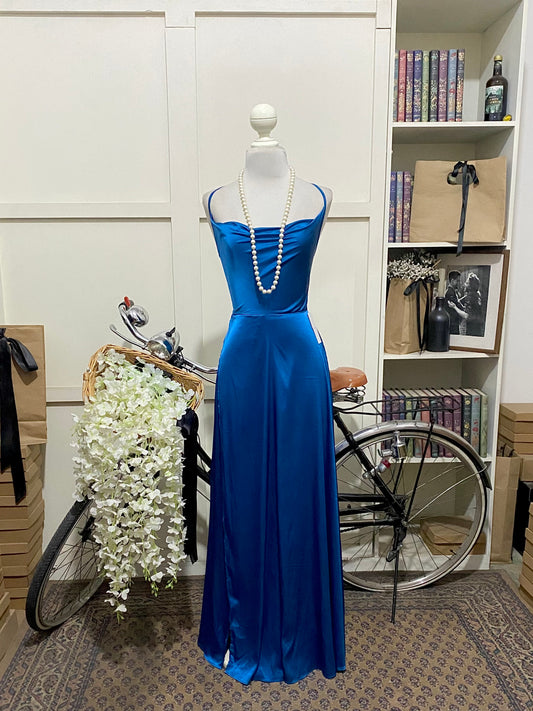 Vania, vestido largo línea A azul rey o real hombros descubiertos