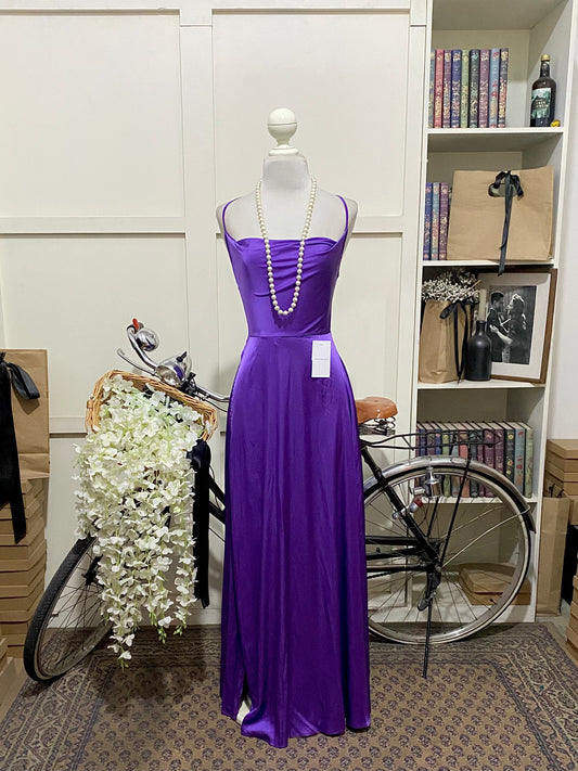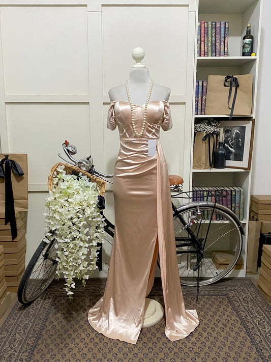Marifer, vestido largo ajustado púrpura polvoriento hombros descubiertos manga caída