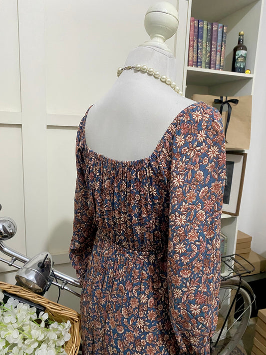 Elin, vestido largo semi recto azul estampado flores manga larga
