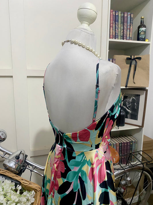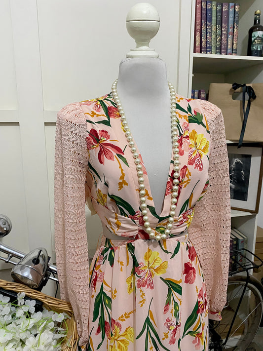 Delfina, vestido largo línea A coral estampado flores manga larga