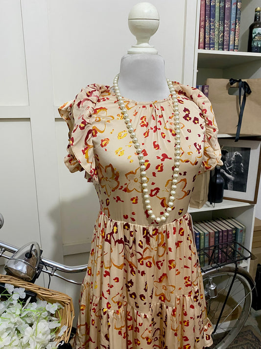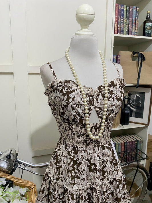 Rachel, vestido corto línea A café flores tirantes