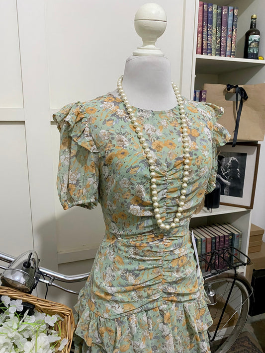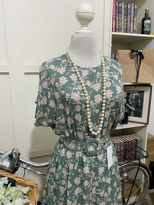 Portia, vestido corto semi ajustado verde flores manga corta