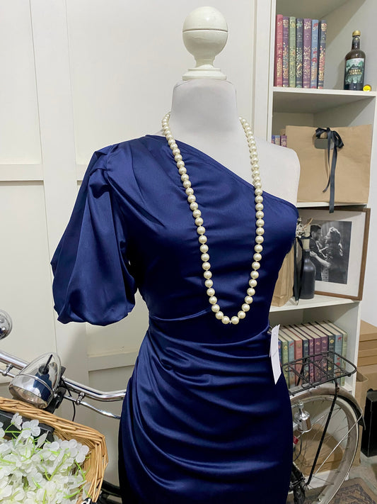 Abril, vestido largo ajustado azul marino una manga