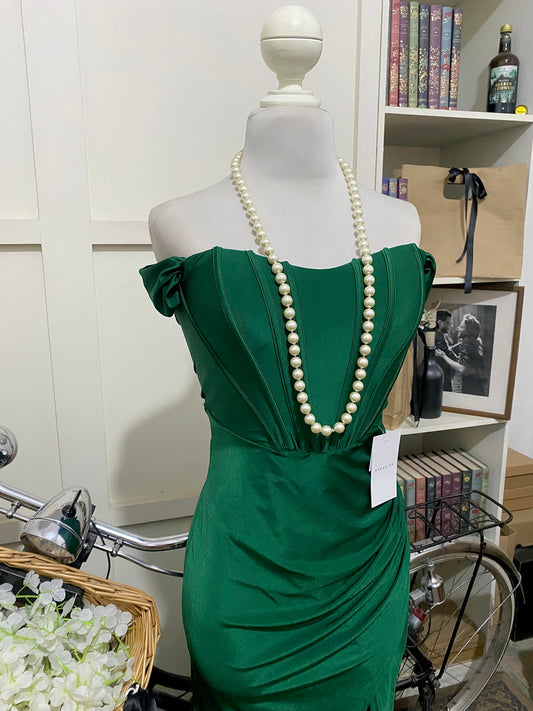 Gelina, vestido largo ajustado verde hombros descubiertos manga caída