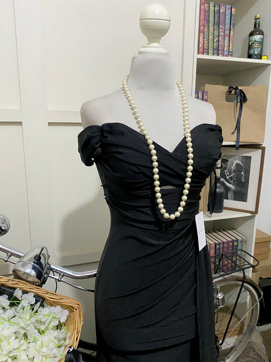 Margot, vestido largo ajustado negro hombros descubiertos manga caída