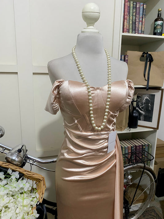 Cayetana, vestido largo ajustado champán hombros descubiertos manga caída