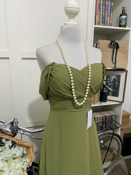 René, vestido largo línea A verde militar hombros descubiertos manga caída